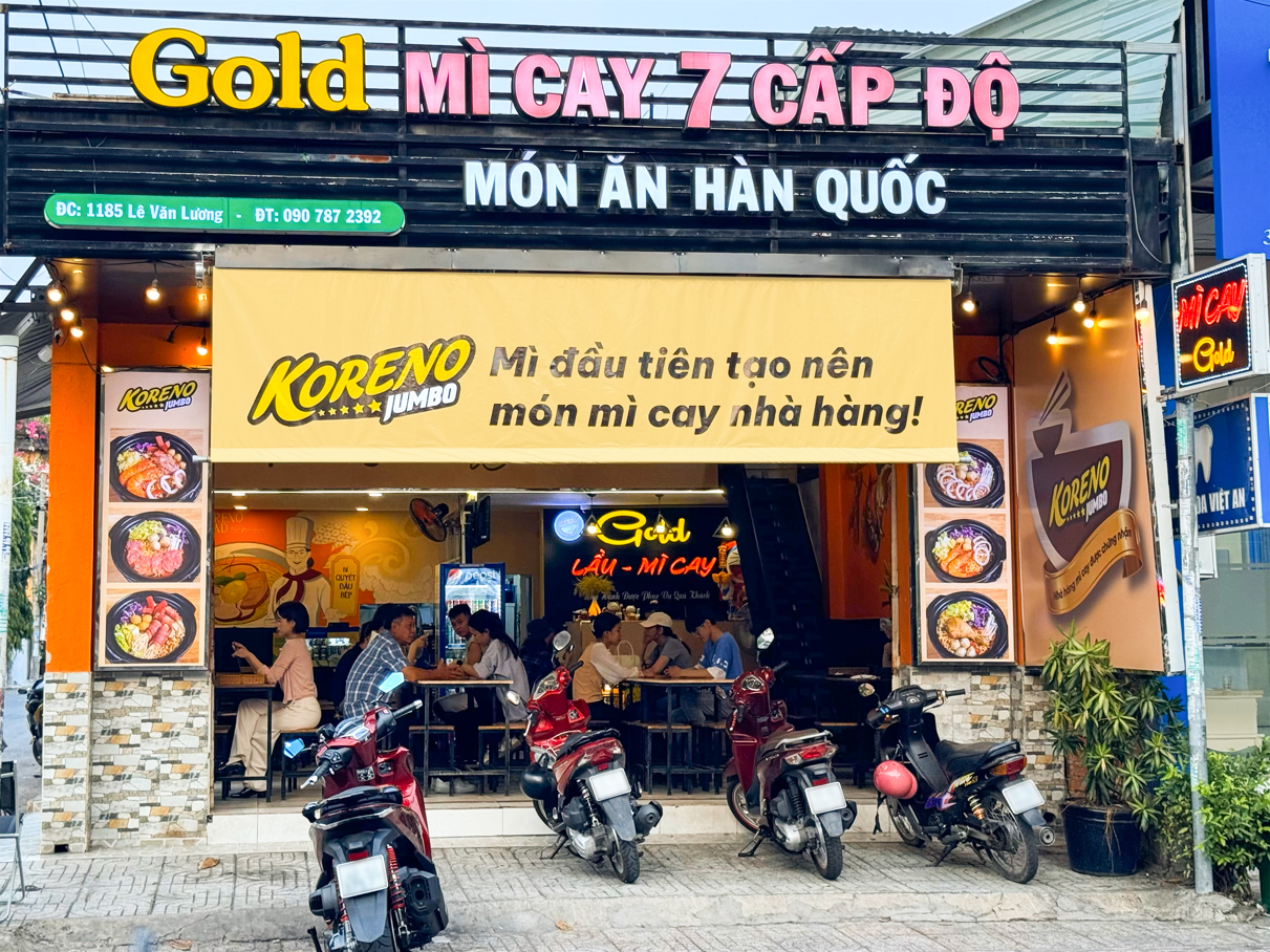 Điểm dừng chân đầu tiên của Koreno Road là quán mì cay Gold, Nhà Bè, TP.HCM, nơi thực khách được thưởng thức mì Koreno Jumbo với sợi mì dai ngon, nước dùng đậm đà chuẩn vị Hàn Quốc.